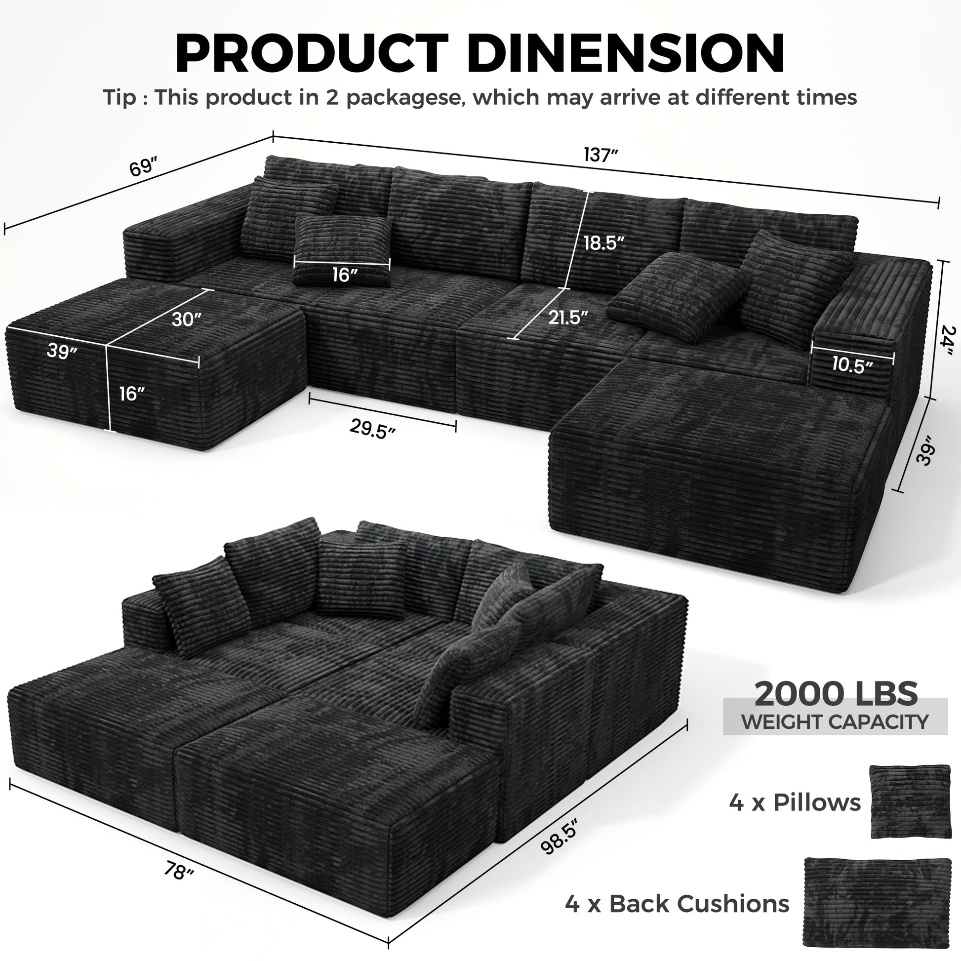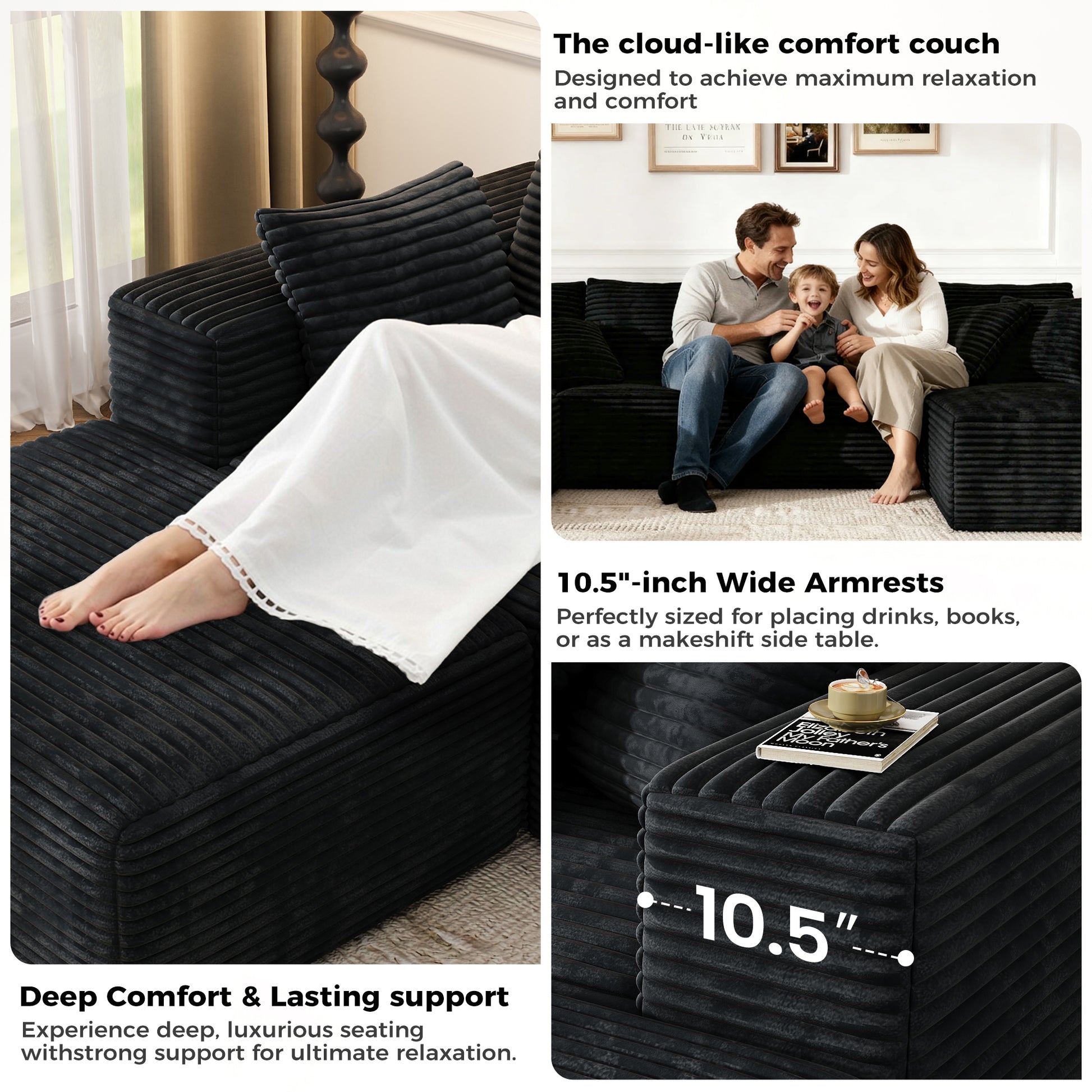137 inch U-Shaped Sectional Sofa, Cloud-Like Big Modular Couch with Chaise, No Assembly Required, High Density Foam Never Sags, Soft Corduroy Fabric Sofa for Large Space, (Black)