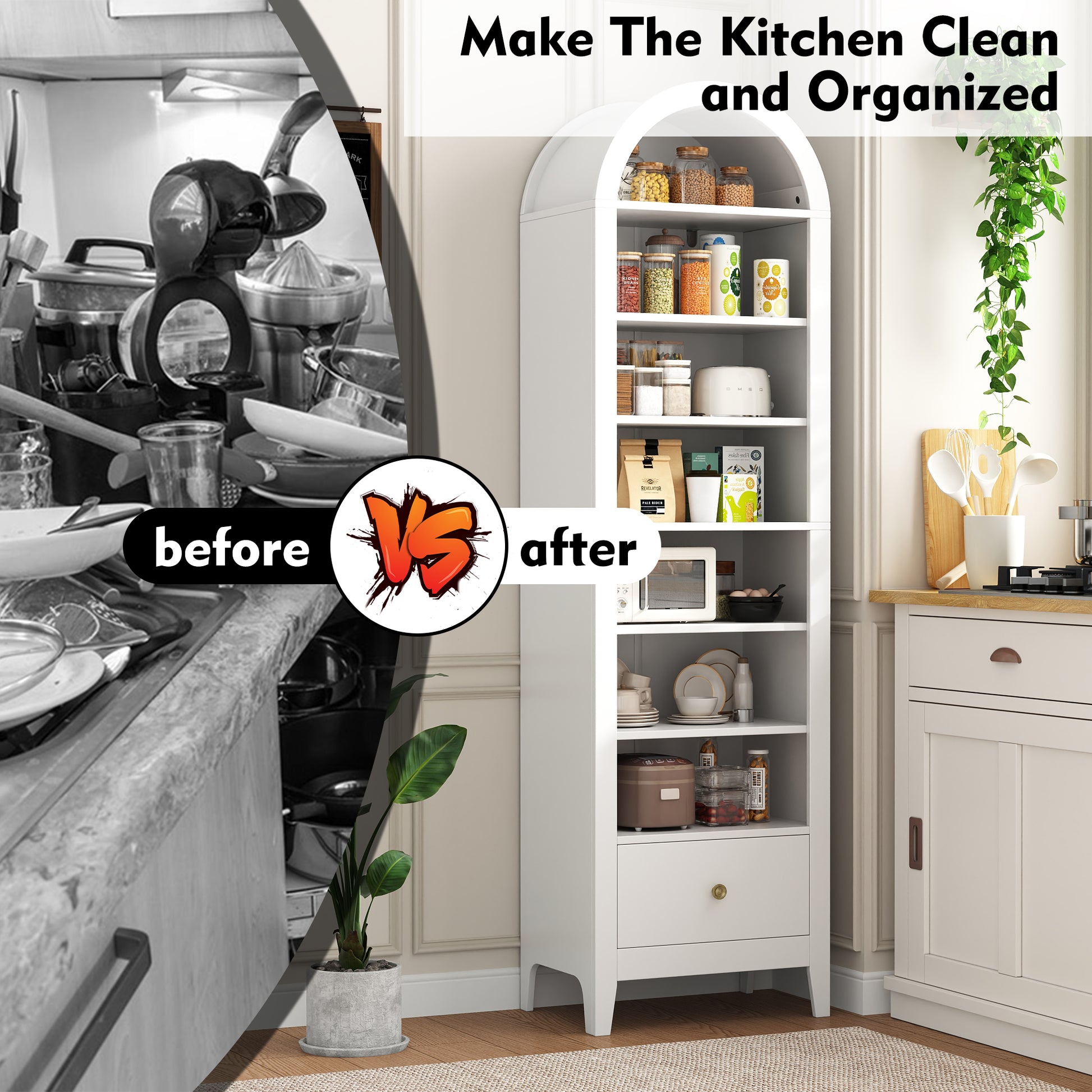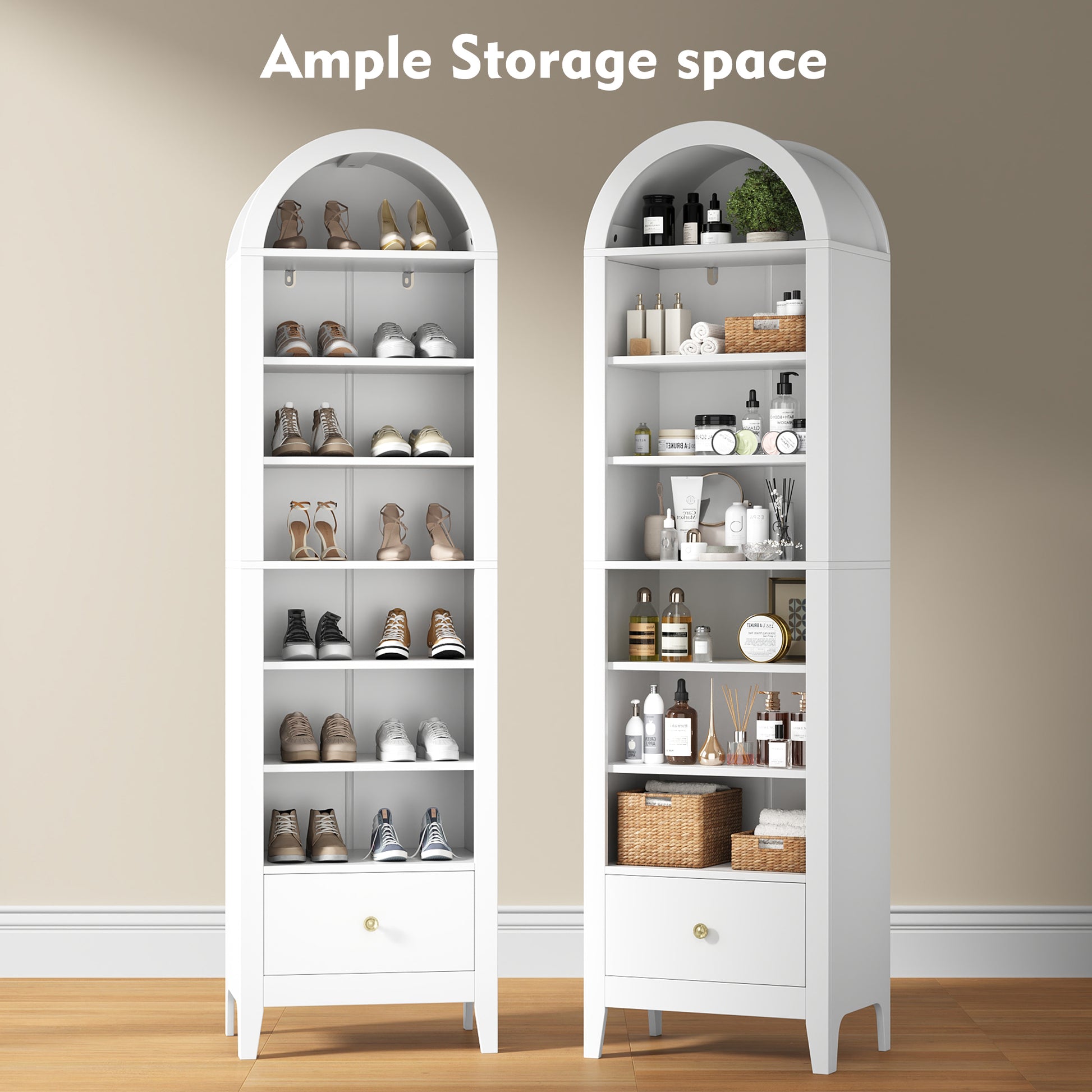 Elevate your home with this elegant arched cabinet, featuring 8 adjustable shelves (30 lbs capacity each) for versatile storage from kitchen to office. Its classic curved design adds charm to any room while the space-saving vertical build fits perfectly in apartments and homes. Easy to assemble and crafted from durable engineered wood for lasting use.
