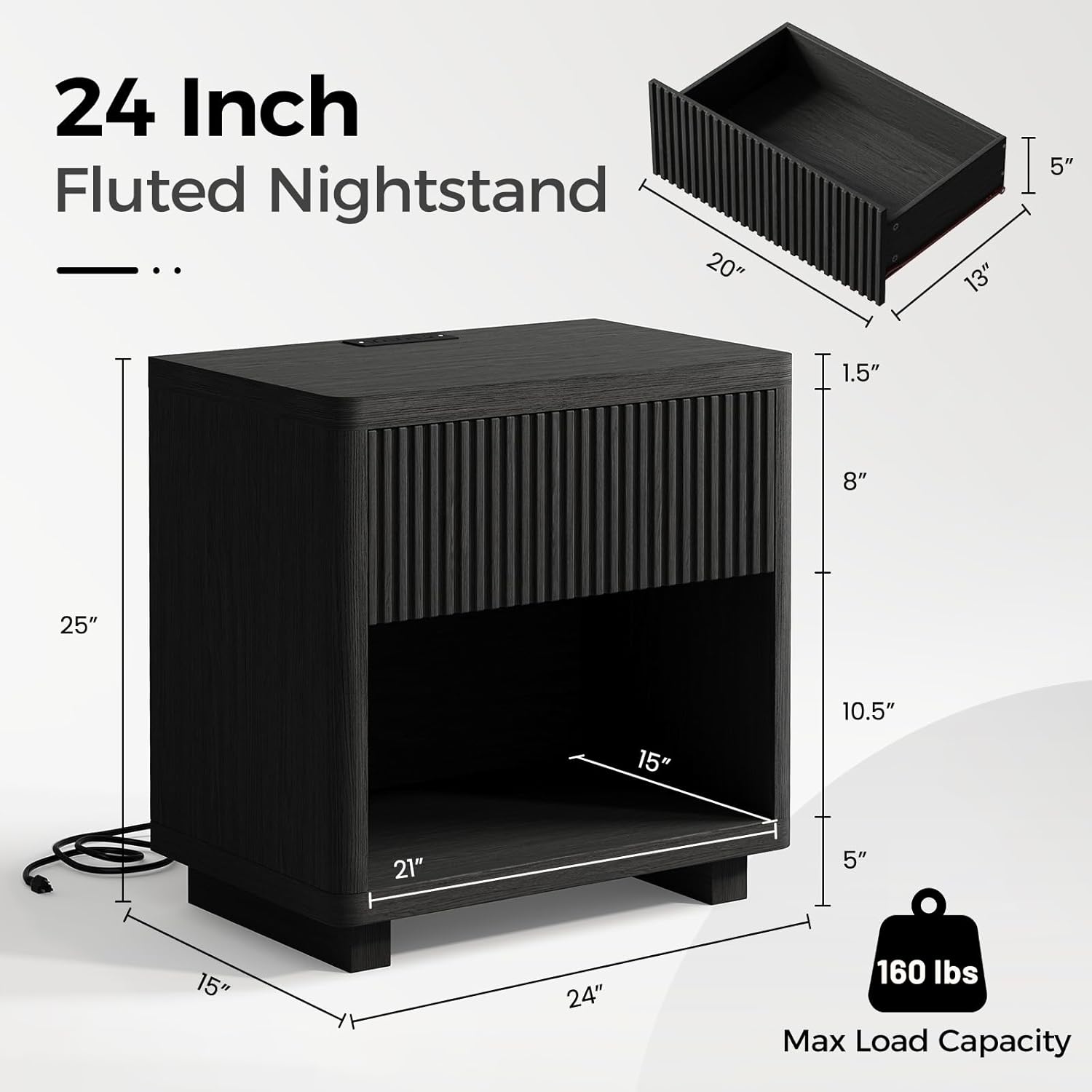 Experience the perfect blend of modern elegance and everyday convenience. This nightstand features a unique fluted design with family-friendly rounded corners, integrated fast-charging ports to keep your devices powered, and spacious storage to declutter your space. Effortless to assemble and versatile for any room, it's the stylish and functional upgrade your home deserves.