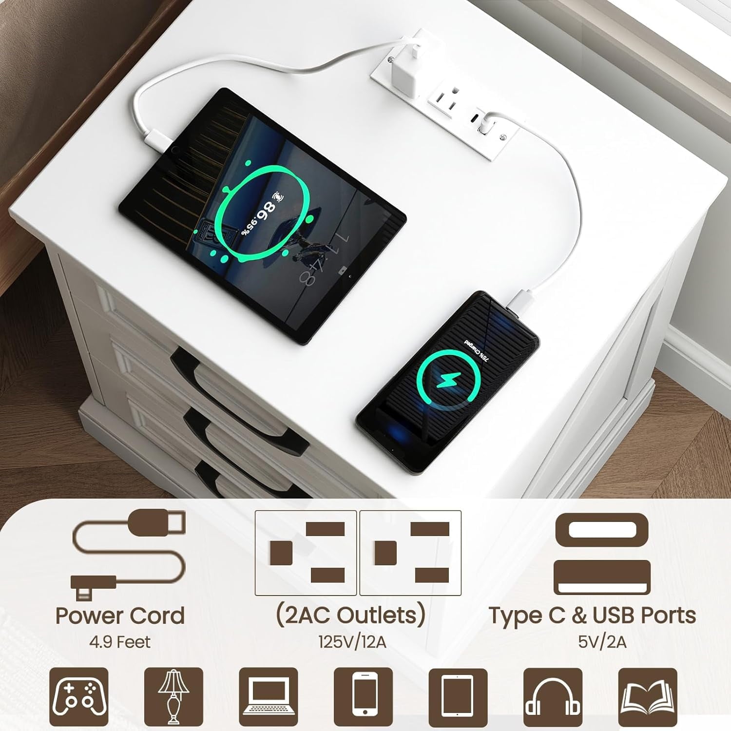 NEGYLIM 2-Piece Nightstand, Farmhouse End Table with Charging Station, 3 Drawers Storage for Bedroom