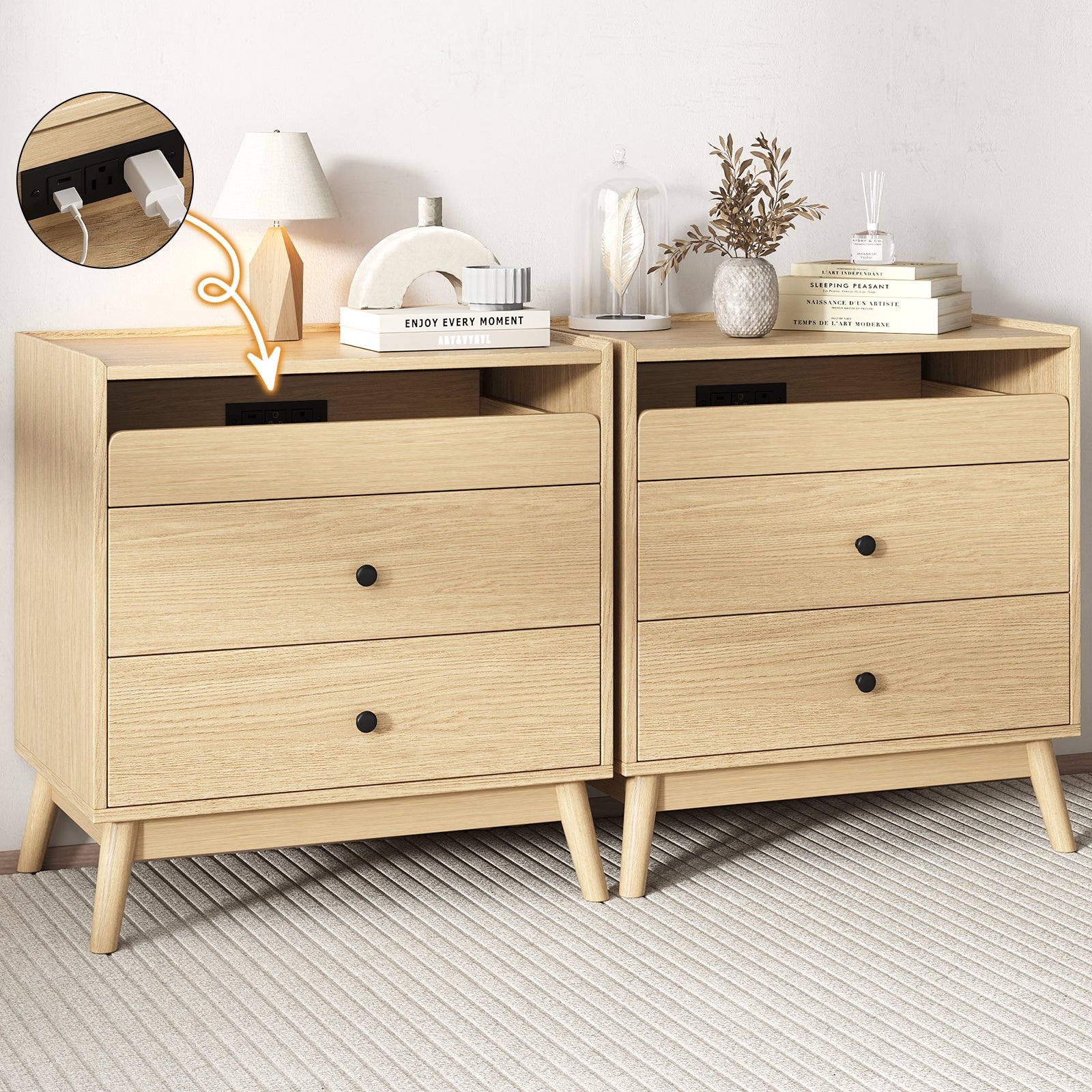 NEGYLIM 3-Drawer Nightstand with Hidden Charging Station, Wood Bedside Table 25" Height x 24" Width, Bedroom Furniture End Table, 2-Pcs