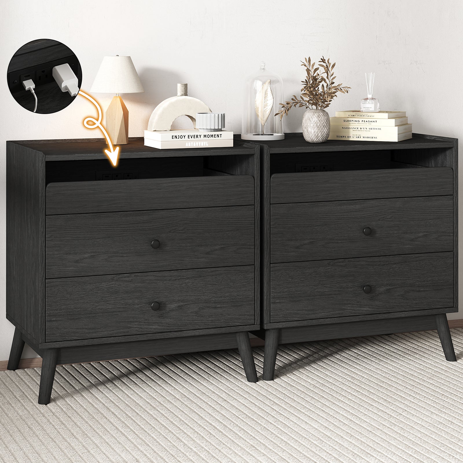 NEGYLIM 3-Drawer Nightstand with Hidden Charging Station, Wood Bedside Table 25" Height x 24" Width, Bedroom Furniture End Table, Black 2-Pcs