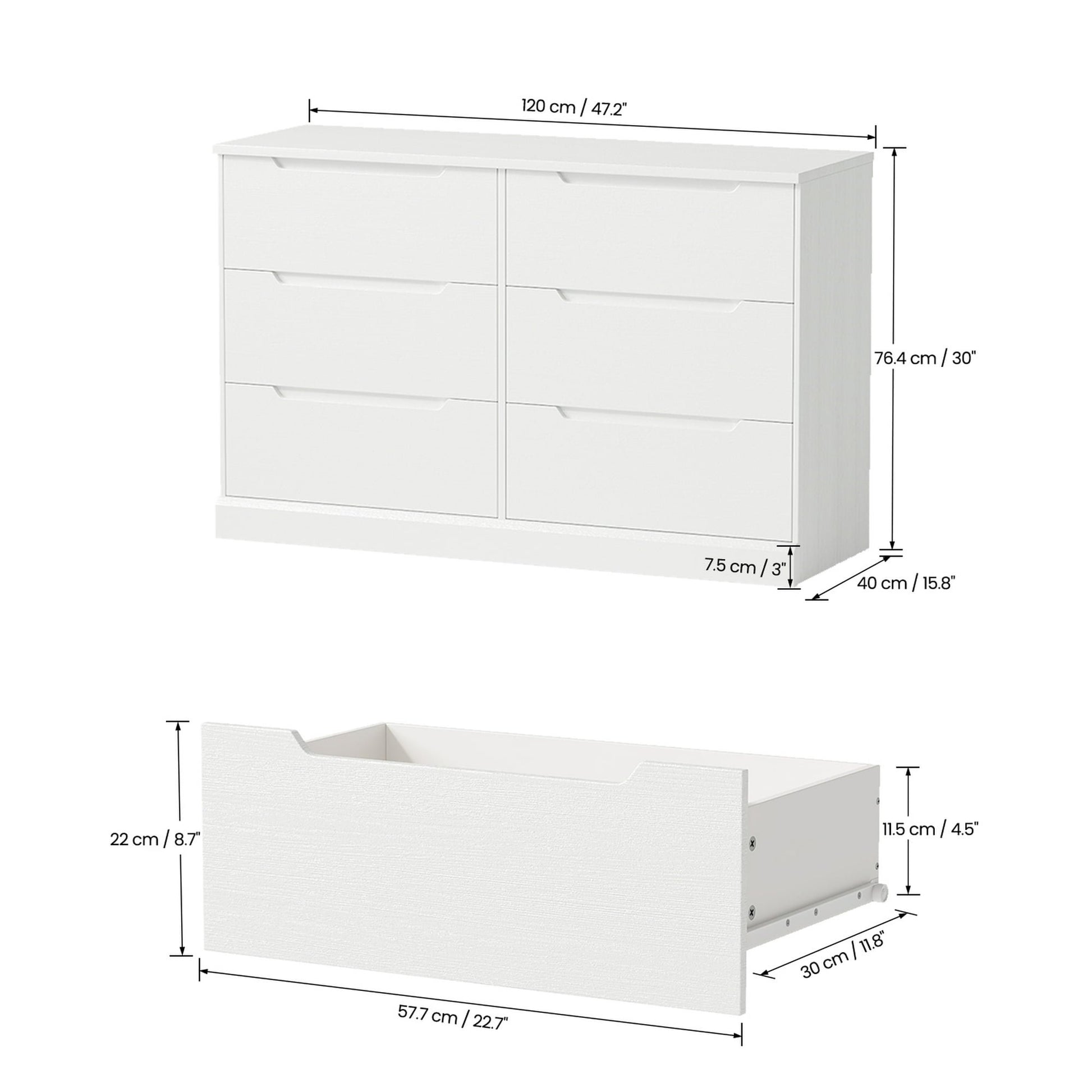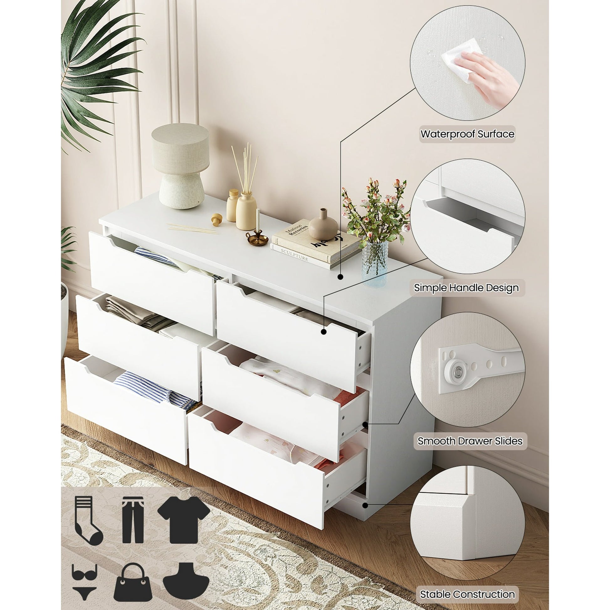 【Space-Saving, Stylish and Elegant】With a generous size (47.2" x 15.8" x 30"), this 6-drawer chest maximizes storage space. Its smooth lines and elegant outline allow it to blend easily into various environments such as bedrooms, living rooms or college dormitories, making it an ideal choice for adults.