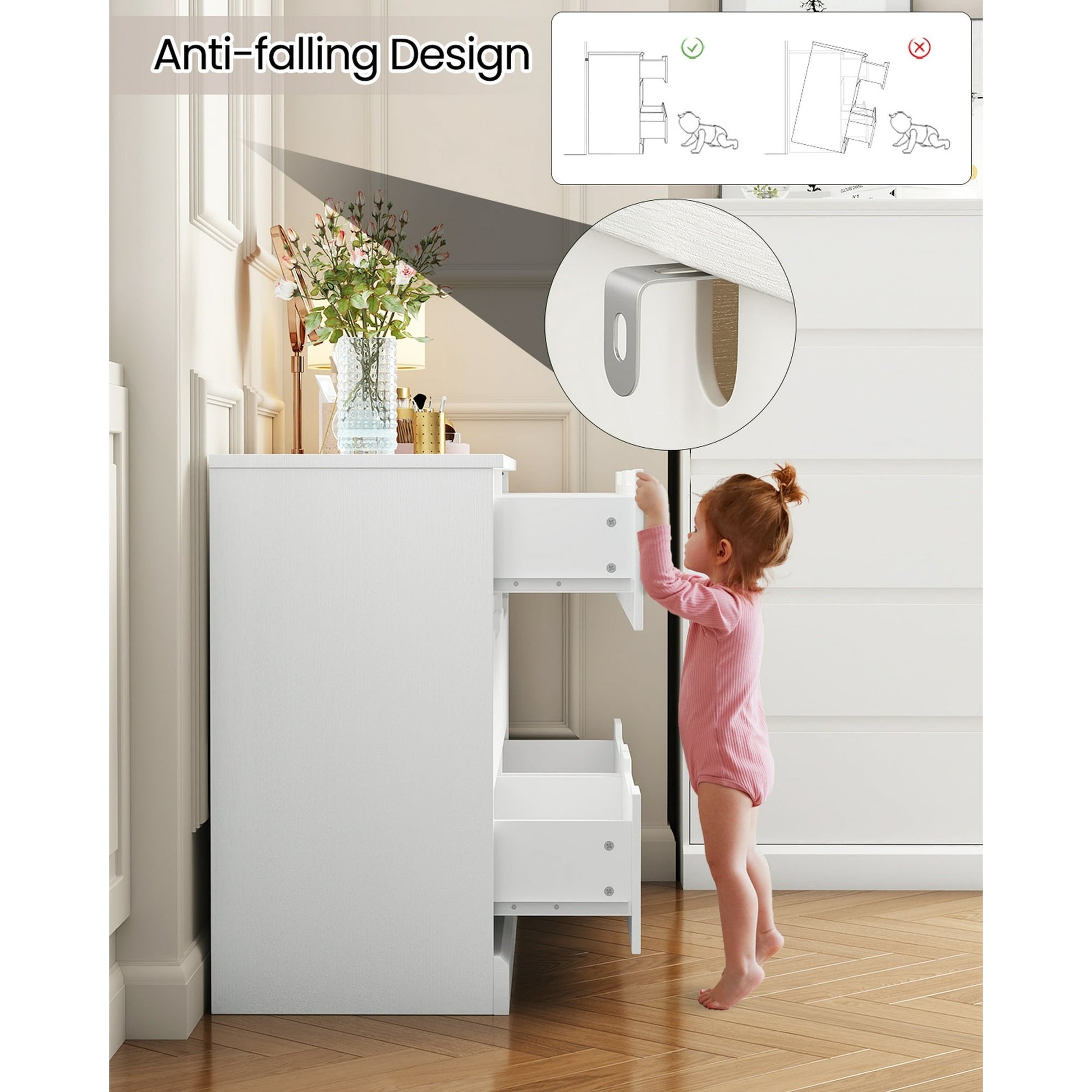 NEGYLIM 6-Drawer Chest of Drawers combines safety, practicality and aesthetics. It not only features an anti-tip design, five large drawer storage spaces, a sturdy and smooth structure, and waterproof and easy-to-clean properties, but also expands storage space, decorates the home, and is easy to assemble with guaranteed after-sales service. Suitable for placement in various scenarios such as bedrooms and living rooms, it is applicable to both adult households and families with children. Each drawer can bear a weight of 30 pounds.