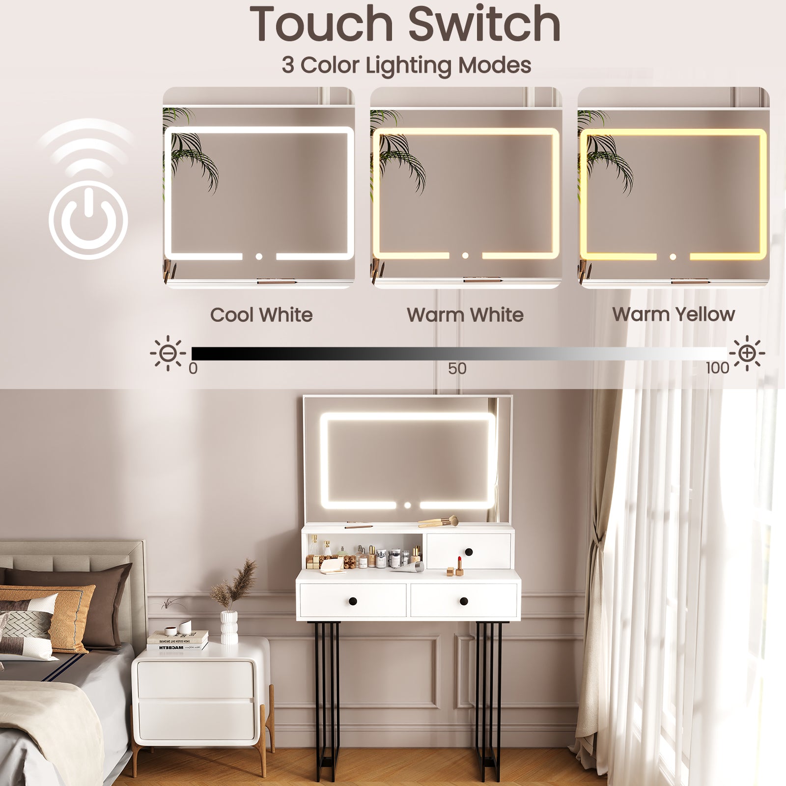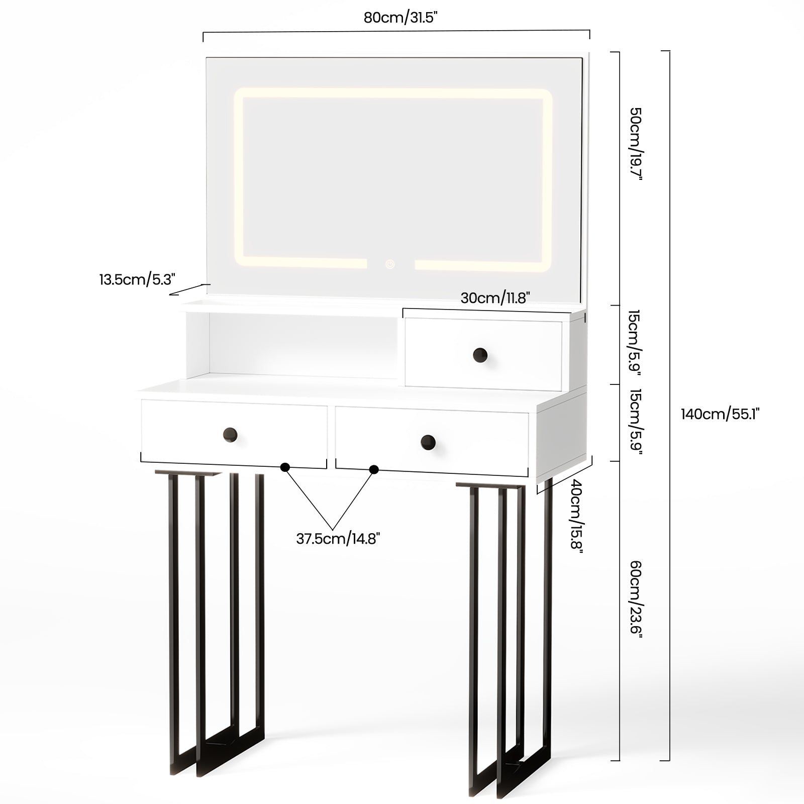NEGYLIM Vanity with LED Lights and Mirror, White Makeup Vanity Desk with Drawers Dressing Tables Dresser Desk 3 Lighting Color Adjustable