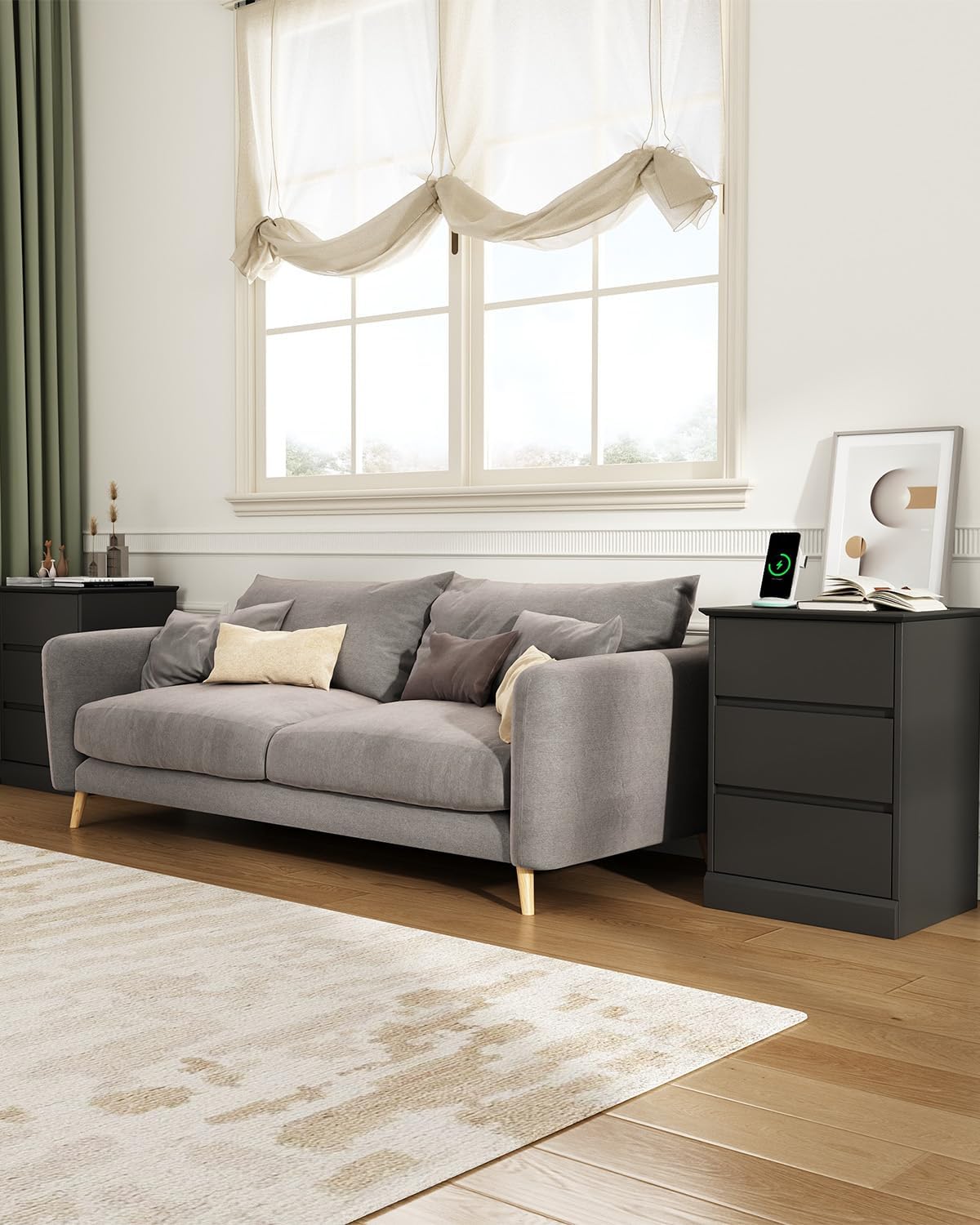 Nightstand with 3 Drawers, Black Bedside Table Night Stand for Bedroom with Charging Station & Cut-Out Handle, Sofa Side Table Dresser for Bedroom(Black)